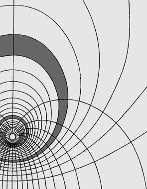 공급량 의(개의 튜브가 달린) 공급원이 한 지점에 있고, 배수구는 그로부터 무한대의 거리에 배치되어 있는 간단한 유체 시스템을 가정해보자. 공급원으로부터 개의 단위 튜브가 사방으로 뻗어 나오기 때문에, 공급원으로부터 거리 만큼 떨어진 위치에서 각 단위 튜브의 단면적은 반지름 의 구면()을 로 나눈 이 되고, 물줄기의 속도는 튜브 단면적의 역수로서 가 된다(그림 4-5 왼쪽 그림 참조). 다시 말해, 공급원으로부터 거리가 증가함에 따라, 각 단위 튜브의 단면적은 거리의 제곱에 비례하여 증가하는 반면, 물줄기의 속도(단위면적당 유량)는 거리의 제곱에 반비례하여 줄어든다(그림 4-5 오른쪽 그림 참조).