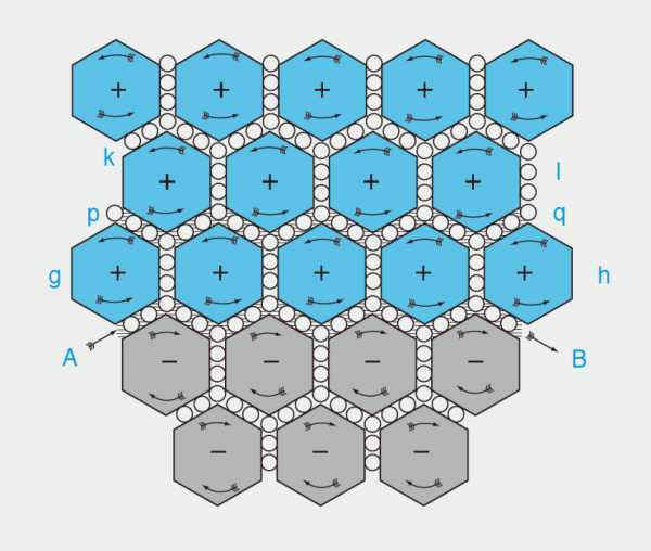 이 방정식은 지난 논문에서 만들어낸 방정식과 동일한 것이었지만 그 의미는 동일하지 않았다. 지난 논문에 쓰인 방정식은 단지 패러데이의 법칙을 수학적으로 재기술한 것에 불과했던 반면, 이번에 유도한 방정식은 기계 모형으로부터 유도된 것으로서 전자기 유도의 기계적인 메커니즘을 담고 있었다. 맥스웰은 그 메커니즘을 직관적으로 설명하기 위해 다음과 같은 그림을 그렸다(그림 4-15). 두 개의 도체(AB, pq) 외에는 모두 절연체로 구성된 시스템에서, 지금 막 A에서 B로 전류가 흐르기 시작했다고 가정하자. A에서 B로 유동 바퀴들이 움직이기 시작하자, 그와 인접한 소용돌이 분자들도 그와 함께 회전하기 시작한다. 위의 소용돌이 분자들(gh)은 시계 반대 방향(+)으로, 아래의 소용돌이 분자들은 시계 방향(-)으로 돌 것이다. 이 소용돌이 분자의 회전은 절연체 내 유동 바퀴의 제자리 회전을 통해 인접한 소용돌이 분자들에 차례차례 전달될 것이다(AB 아래의 경우). 그러나 회전하는 소용돌이 분자(gh)와 멈추어 있던 소용돌이 분자(kl) 사이에 놓인 도체(pq)에서는 자유롭게 움직일 수 있는 유동 바퀴가 양편의 회전 속도 차이에 의해 q에서 p 방향으로 구르게 되어 유도 전류가 만들어진다. 만약 도체 pq에 저항이 없다면, 유동 바퀴는 영원히 움직이면서 도체 너머의 소용돌이 분자에는 운동을 전달하지 않을 것이다. 그러나 실제 도체는 저항이 있기 때문에, 움직이던 유동 바퀴는 서서히 멈춰서 제자리에서 회전하면서 도체 너머의 소용돌이 분자(kl)에도 운동, 즉 자기 작용을 전달하게 된다. 즉 이 소용돌이 분자-유동 바퀴 모형은 전류의 자기 작용이 어떻게 멀리까지 전달되는지, 어떻게 유도 전류를 만들어내는지, 그리고 왜 그 유도 전류는 금방 사라지는지까지 “기계적으로” 설명해준 셈이었다.